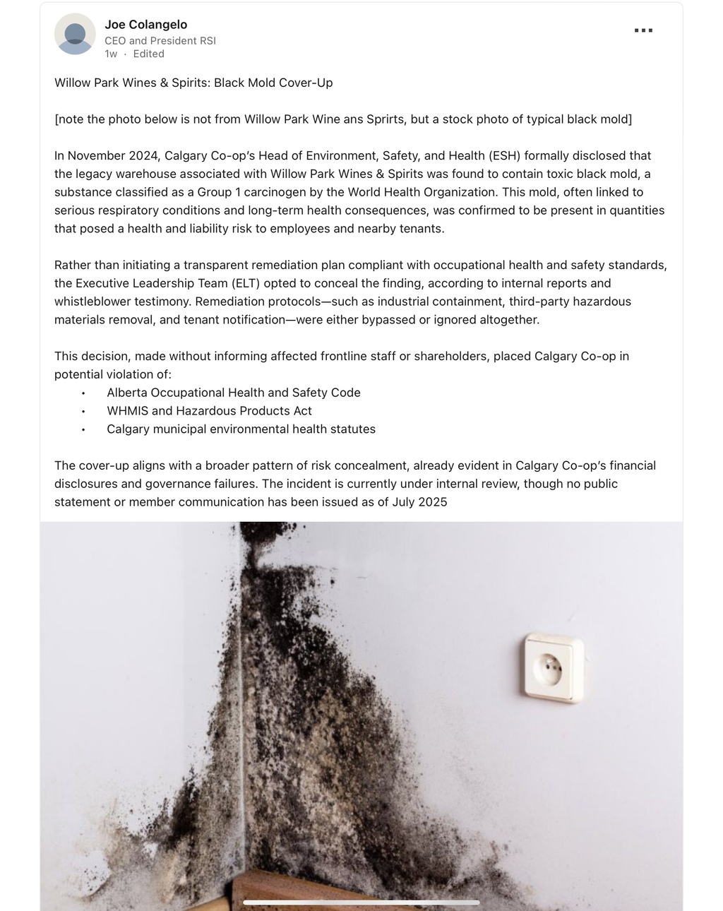 Mr. Colangelo previously published several online posts related to Calgary Co-op and his advocacy efforts. Those posts are no longer publicly accessible. For reference, screenshots were taken while they were available so that readers may understand the context of statements he made at that time. This petition does not suggest any specific reason for their removal.