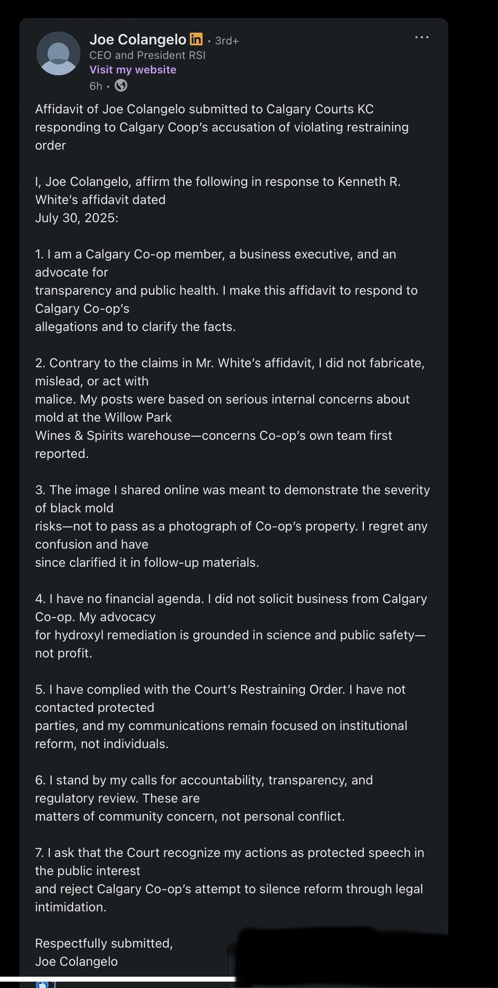 In 2025, Mr. Colangelo published a LinkedIn post responding to Calgary Co-op’s accusation of violating a restraining order against Mr. Joe Colangelo. In that post, he stated: