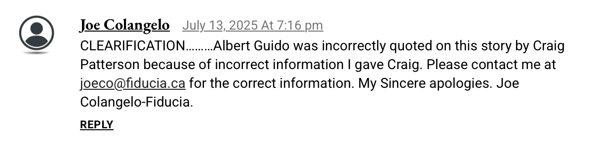 “ Albert Guido was incorrectly quoted on this story by Craig Patterson because of incorrect information I gave Craig. Please contact me at joeco@fiducia.ca for the correct information. My sincere apologies. Joe Colangelo, Fiducia”.