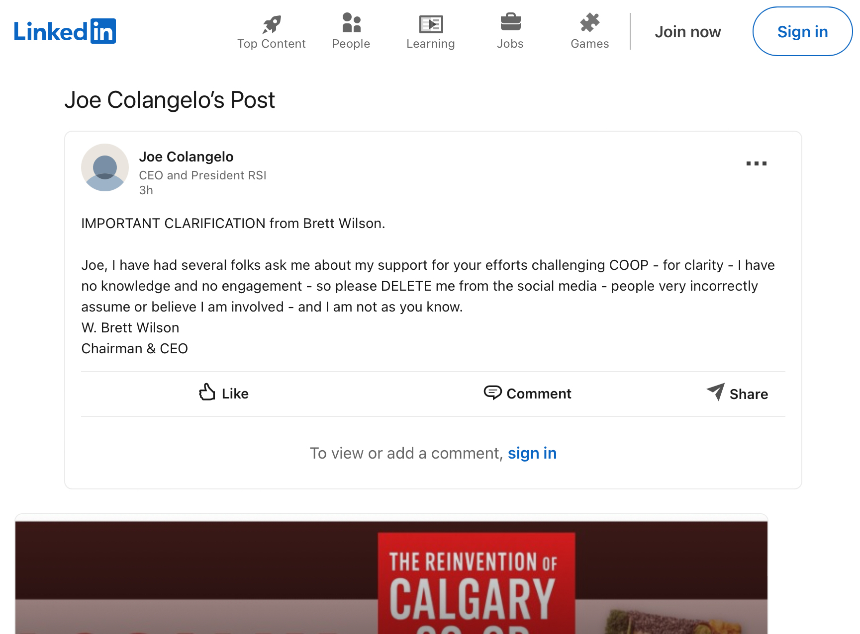 This public clarification, appearing on Mr. Colangelo’s own LinkedIn page, confirms that Mr. Wilson has disclaimed any knowledge of, or involvement in, Mr. Colangelo’s Calgary Co-op campaign.